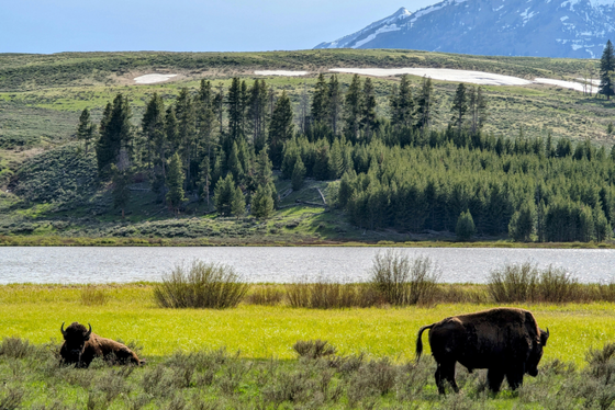 連綿的13座⼭峰、冰河鑿成的傑克森湖與藍⾊勿忘我如詩如畫。標⾼4千公尺的⼤堤頓⼭,電影公司派拉蒙的片頭標誌如實呈現在眼前。