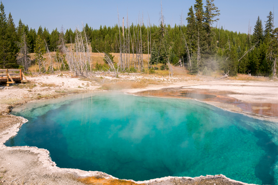 它是黃石公園面積最大的溫泉池,色彩繽紛豔麗,有如彩虹般的紅、澄、黃、綠、藍、靛、紫等七彩色,沿著池畔的木板步道,可以一覽大稜鏡溫泉的奧妙。
